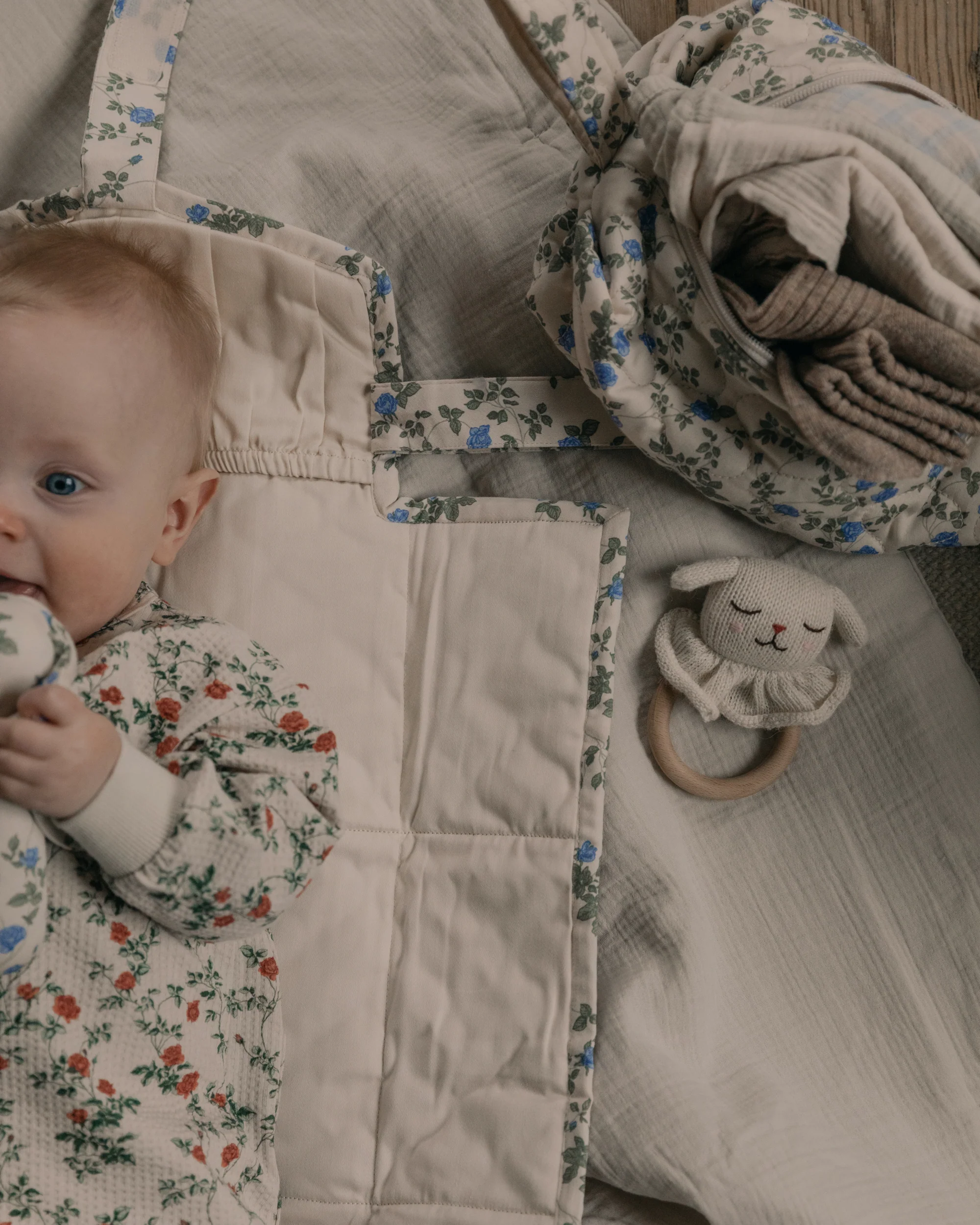 Portable changing mat that provides the little ones with a soft and clean place to lie on when it's time for a nappy change on the go. It features spacious pockets inside for diapers, wetwipes and an extra change of clothes. Made in organic cotton satin with a BIONIC-FINISH® ECO treatmet making it dirt- and water-repellent.